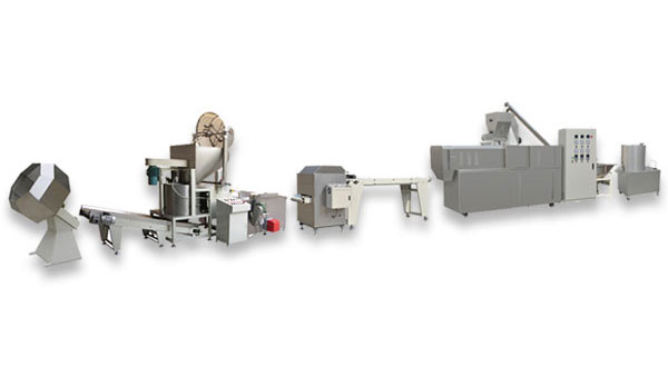 The Crispy Chips/Bugles/Sticks processing line uses raw material of rice flour, corn flour, flour, or its mixture. The shape can be changed only by changing the die, molding machine and cutting machine: strips, corrugated square sheets, diamond-shaped slices, wavy slices, pillow shapes, and horn corners.